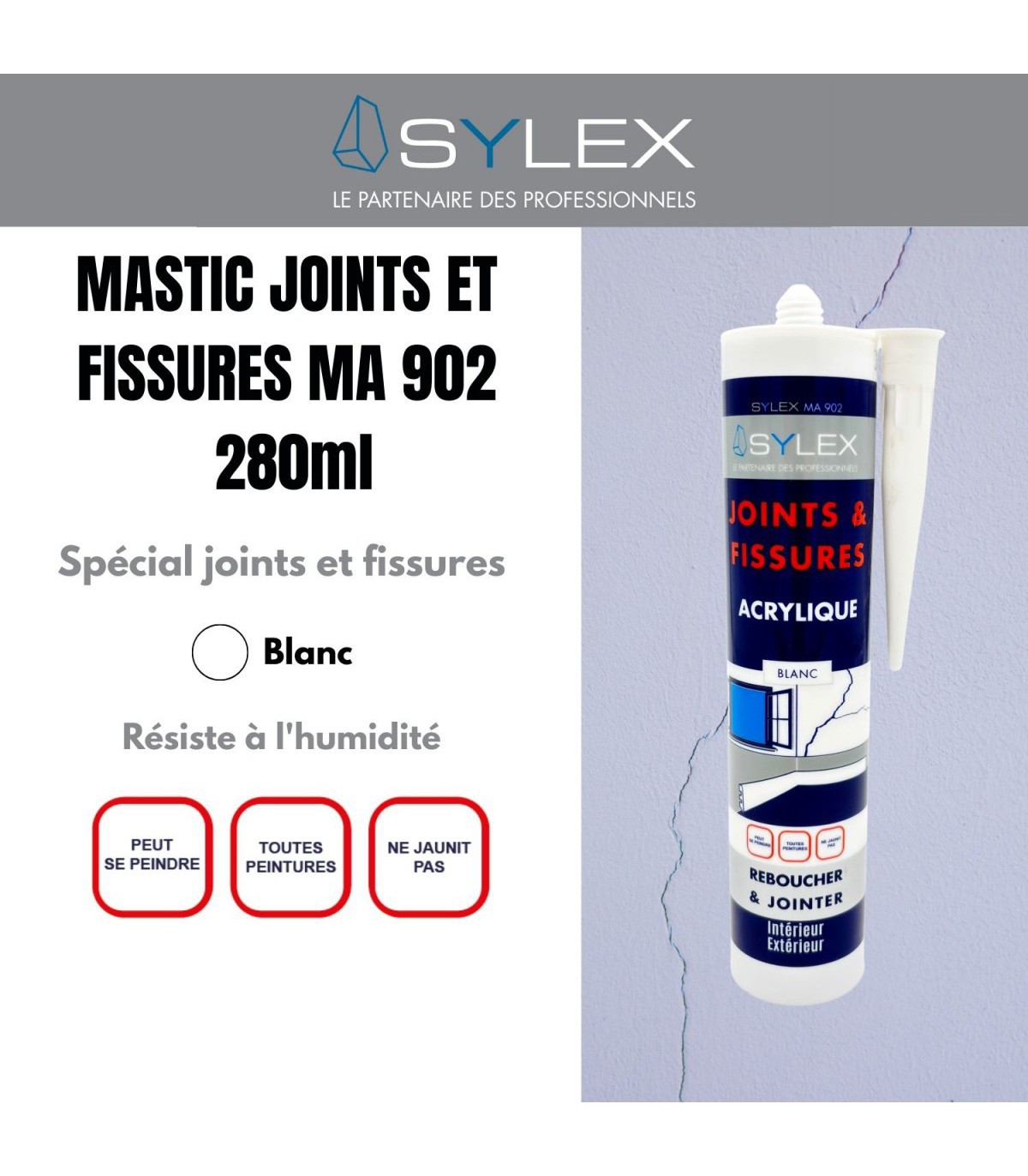 Le mastic acrylique SYLEX MA est un produit professionnel conçu pour la réalisation de joints à faible mouvement et le rebouchage de fissures sur supports poreux. Grâce à sa formulation plasto-élastique, il offre une excellente souplesse tout en garantissant une finition propre et durable.